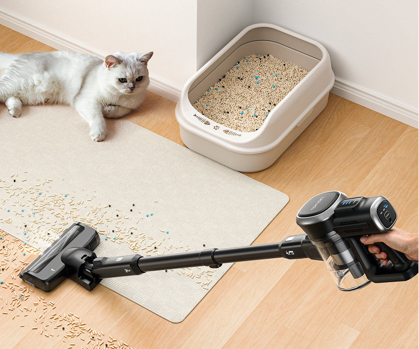 LBL 202 er udstyret med en kraftig rullebørste, der nemt og effektivt fjerner hår og snavs fra alle typer gulve. Det smarte design sikrer, at hår ikke vikler sig ind, så rengøring af børsten er minimalt. Med den indbyggede LED-belysning kan du nemt spotte støv i mørke hjørner og sikre en endnu mere grundig rengøring.