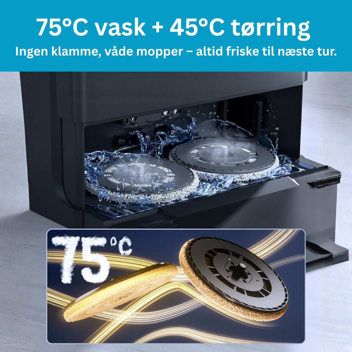 Den tømmer støv, håndterer moppevask og tørrer mopperne med varme – så du slipper for at stå med det i hverdagen.