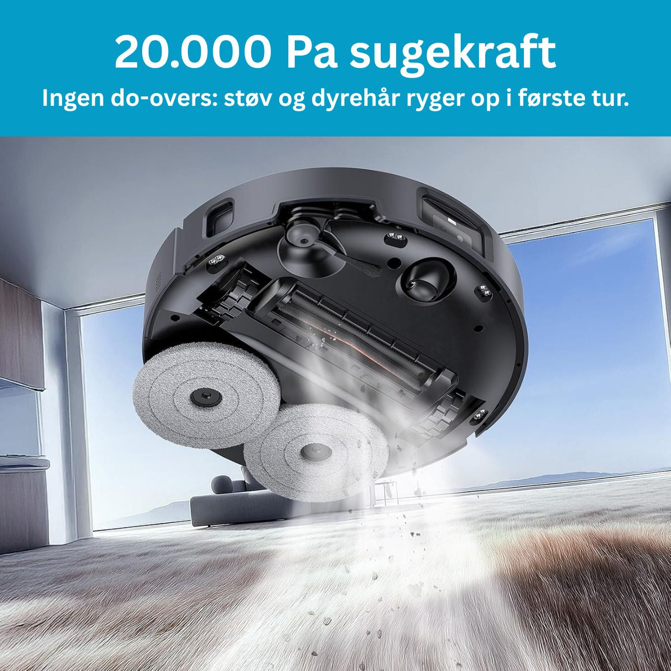 Premium robotstøvsuger med 20.000 Pa sugekraft og Al Vision, der målretter gulvvask ved pletter. Den klarer dørtrin op til 30 mm, håndterer hår med indbygget kniv i rullebørsten og rengør helt ud til kanter med udtrækkelige mopper.