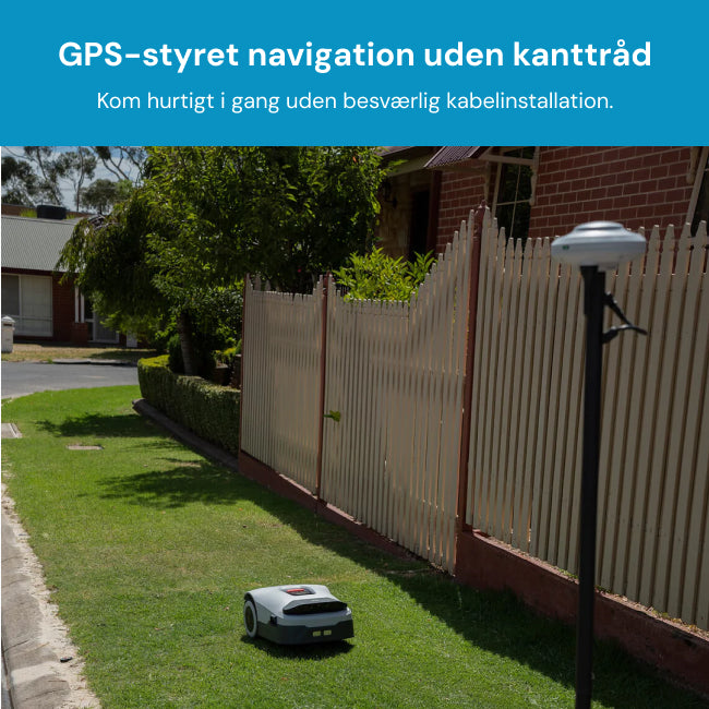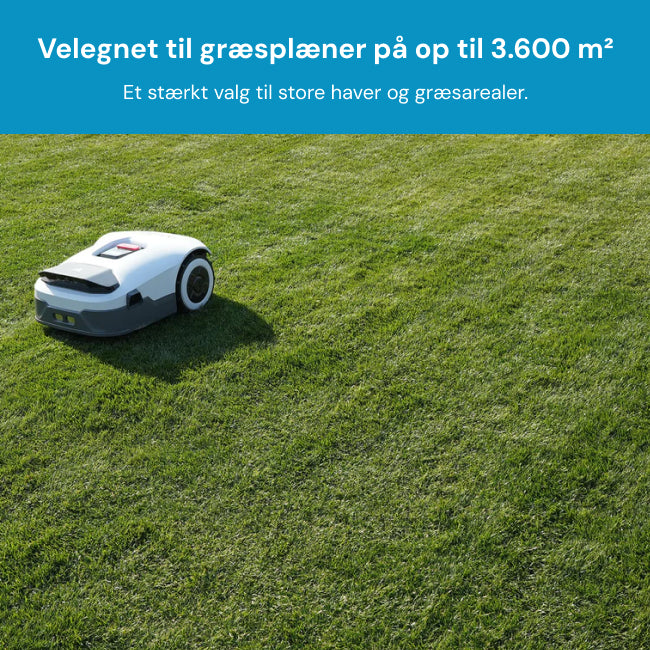 En trådløs robotplæneklipper til mellemstore (og også større) haver, der klipper systematisk i baner. Den kombinerer RTK med AI-vision (5 kameraer, 300°) for præcis navigation, nem zonestyring og ingen kanttråd.