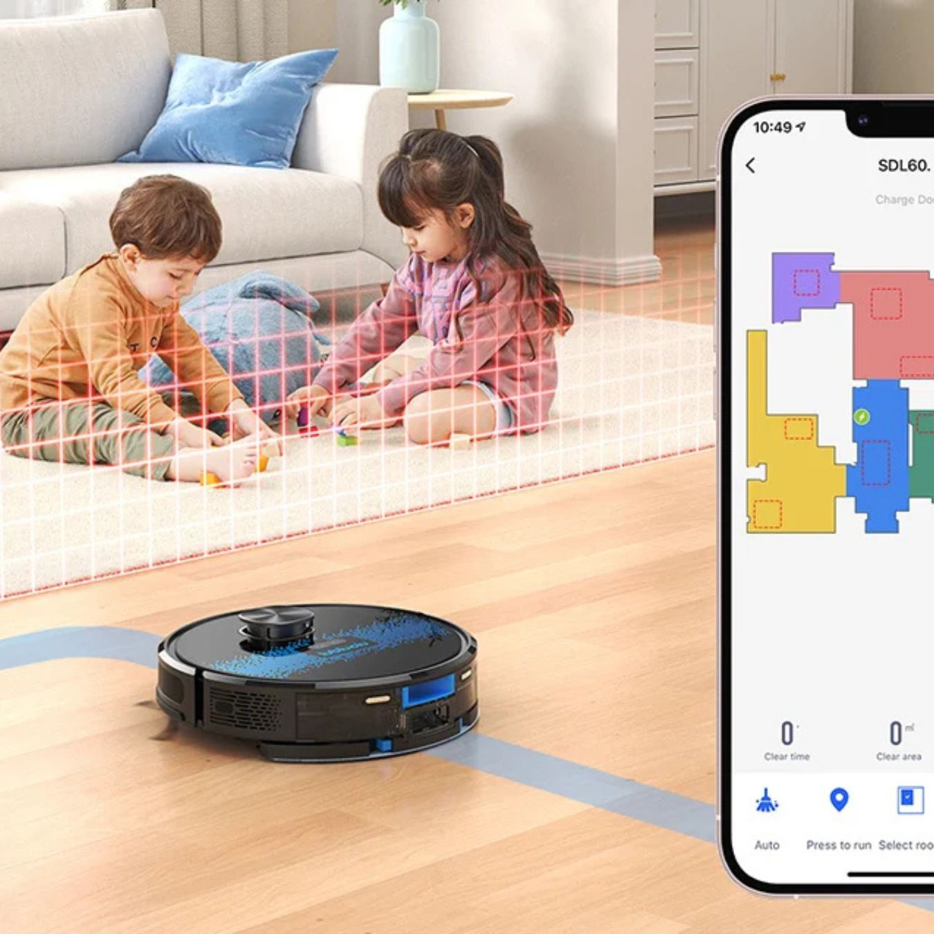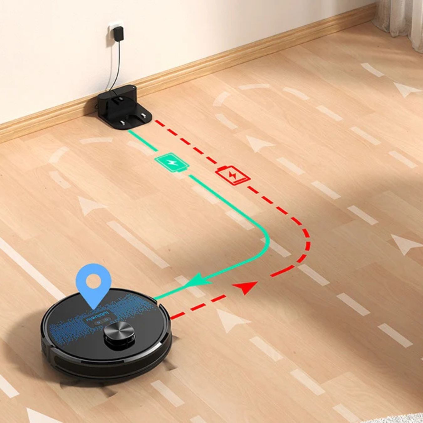 Ja! LBL SL60 bruger avancerede sensorer og kortlægning til at navigere effektivt uden at sidde fast. Den scanner dit hjem, skaber et præcist kort og undgår forhindringer som møbler og ledninger. Hvis der er områder, du vil undgå, kan du nemt oprette no-go zoner i appen, så den holder sig væk fra f.eks. tæpper med lange fibre.